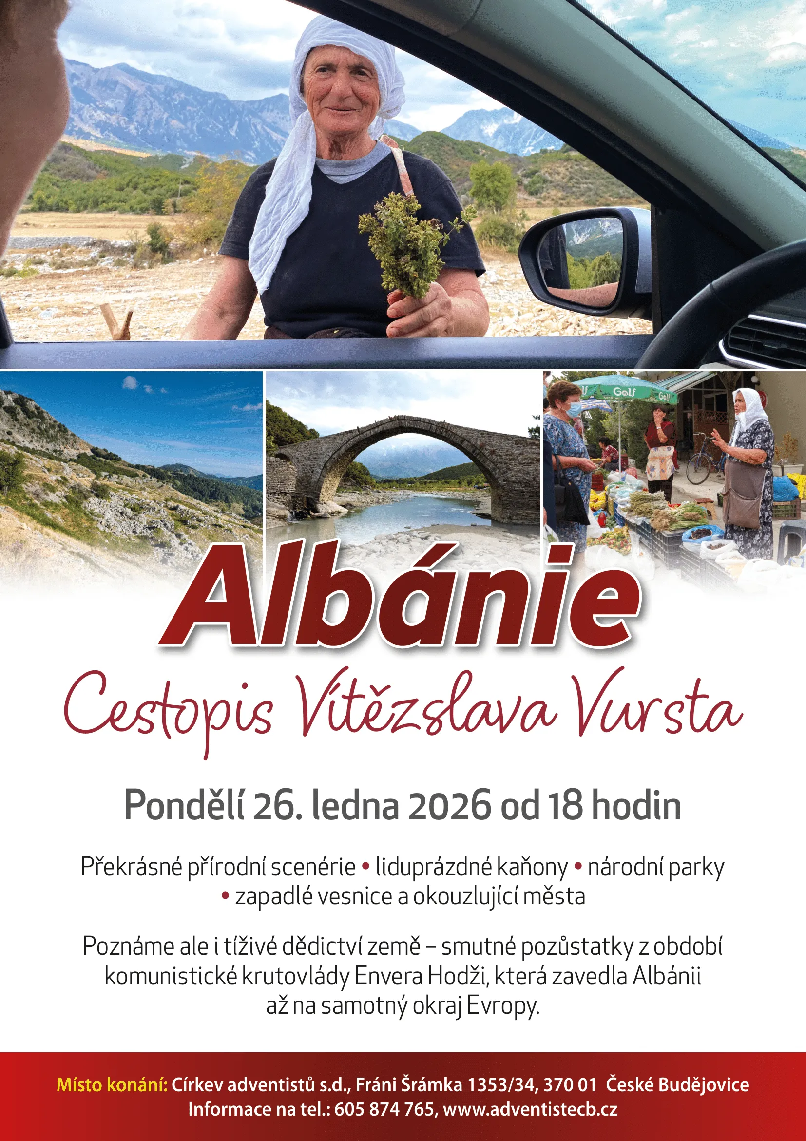 Zveme vás na cestopisnou přednášku Vítězslava Vursta, která vás provede Albánií od divoké přírody až po okouzlující města. Společně navštívíme národní parky, projdeme se liduprázdnými kaňony a nahlédneme i do života v odlehlých vesnicích. Součástí vyprávění bude také připomínka temnějších kapitol albánské historie – pozůstatků komunistické krutovlády Envera Hodži, která zemi na dlouho izolovala od zbytku Evropy. Více informací se dozvíte na www.adventistecb.cz.